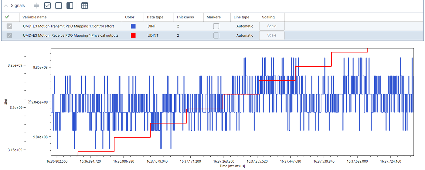 Der KPA EtherCAT Analyzer bietet eine intuitive Visualisierung von Prozessvariablen (Eingänge/Ausgänge) und ermöglicht es dem Benutzer, bestimmte Signale gezielt zu überwachen, durch Zeitachsen zu zoomen und Werte an jedem beliebigen Punkt präzise zu analysieren.